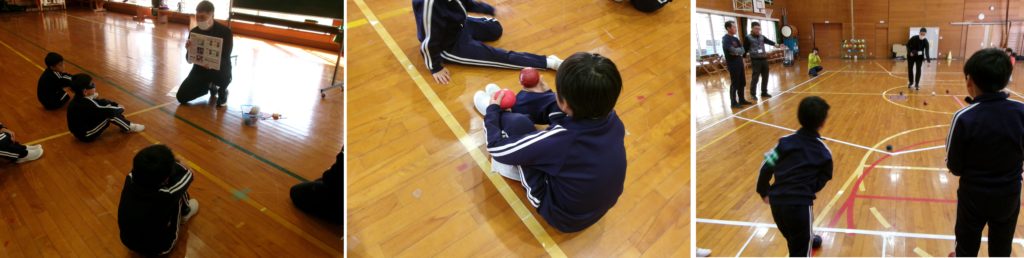 はじめにボッチャとはどのような競技なのか、ルールも含めて説明を受けました。中にはすでに体験している児童もいました。ボールを持つ体験では、ボールを手にして「えっ、こんなに重いの。」「これなら、あまり転ばないな。」と、感想を述べていました。