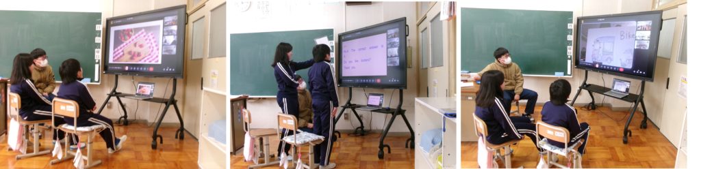 6年生は、タイのバンコク日本人学校の児童とオンラインで交流しました。寺前小学校の6年生と3クラスをつなぎ、それぞれが調べてきた内容をクイズ形式で発表し合いました。