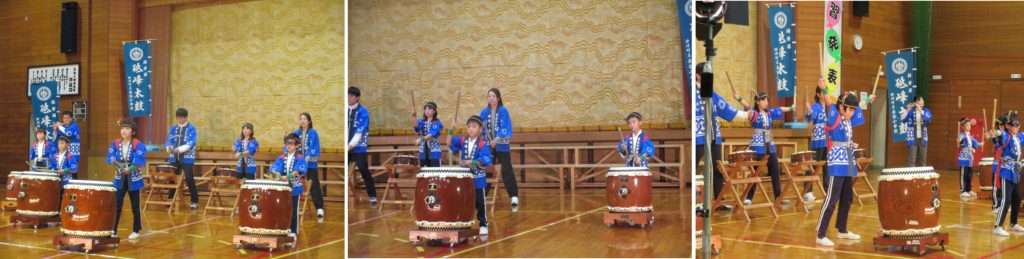 はじめに小学生が太鼓「太鼓ばやし」を披露しました。1年生の児童は、上級生の動きを見ながらしっかりと叩きました。6年生を中心に、心を1つにした力強い演奏でした。