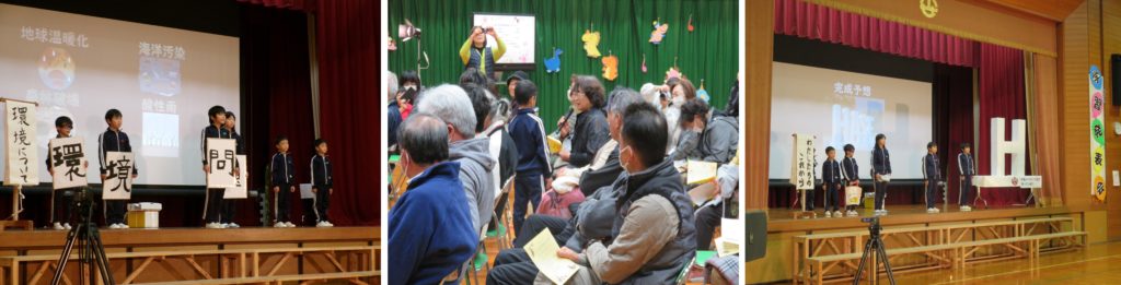 次に、全校生で学習してきた「環境問題」について発表しました。ゴミの種類やゴミ処理の方法、3R(リデュース・リユース・リサイクル)などについて発表しました。