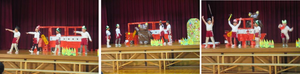 最後に、幼稚園児が「ねじまきバス」の劇を披露しました。バスの運転手やカエル、モグラ、てんとう虫になりきって元気な声で演じたり歌ったりしました。
