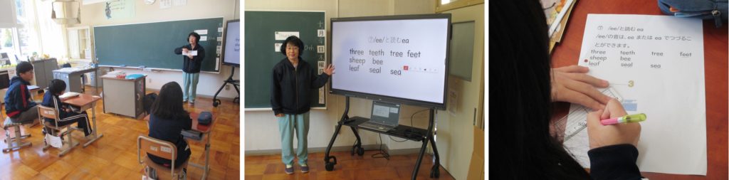 6年生は外国語の授業を行っています。先生会ら単語の発音や会話の仕方を学んでいます。この日は「ee」や「ea」の発音を教えていただきました。また、発音の練習をしたあと、プリントで発音する場所に線を引いて学習を深めていきました。上手に発音できたときは、「Nice!!」と先生からほめてもらいました。