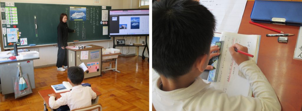 1年生は、国語「いろいろな ふね」の授業です。教科書を読み、それぞれの船の役目や作りを読み取っていく学習をしました。大切なところを自分で見つけて教科書に線を引くことができました。先生から「よくできましたね。」とほめてもらうと、少し照れながらうれしそうにしていました。