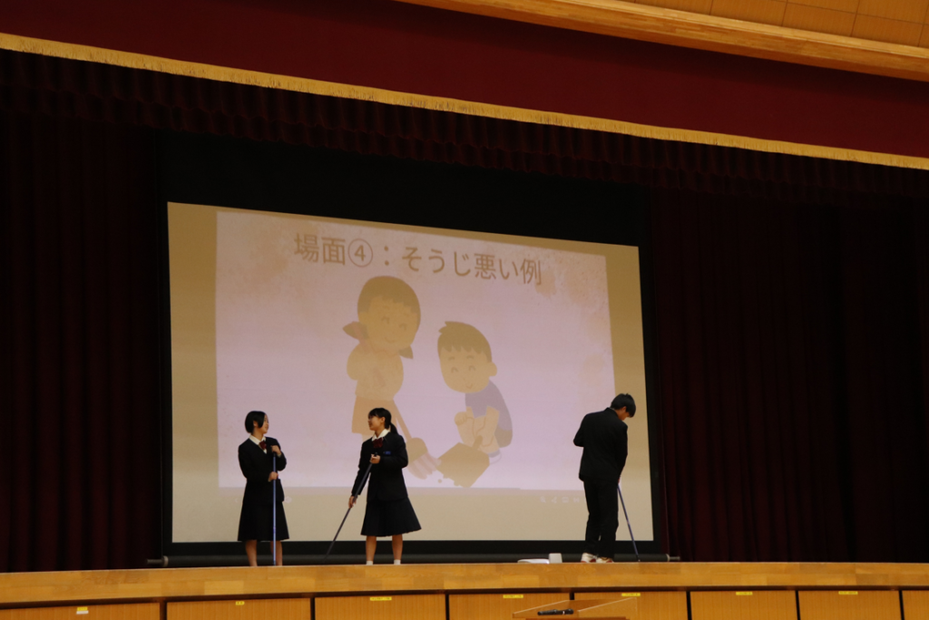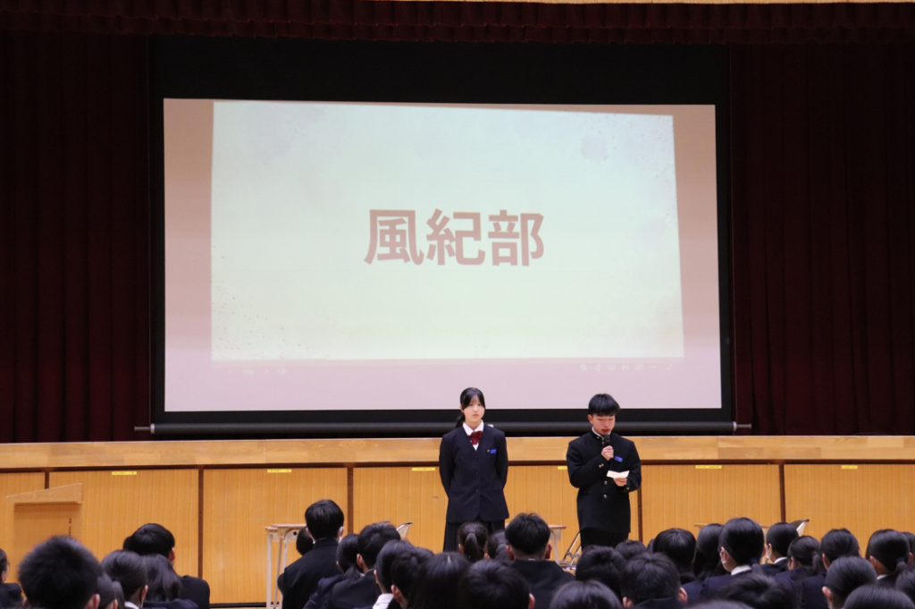 新入生に向けて、生徒会の3年生が中心となって、専門部活動の内容や学校での過ごし方を寸劇を交えて紹介しました。
