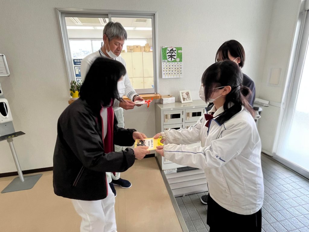 今まで給食でお世話になった給食センターの職員さんに向けて、3年生の代表生徒が感謝状をお渡ししました。今までの感謝の気持ちを、給食センターの職員さんに伝えることができました。