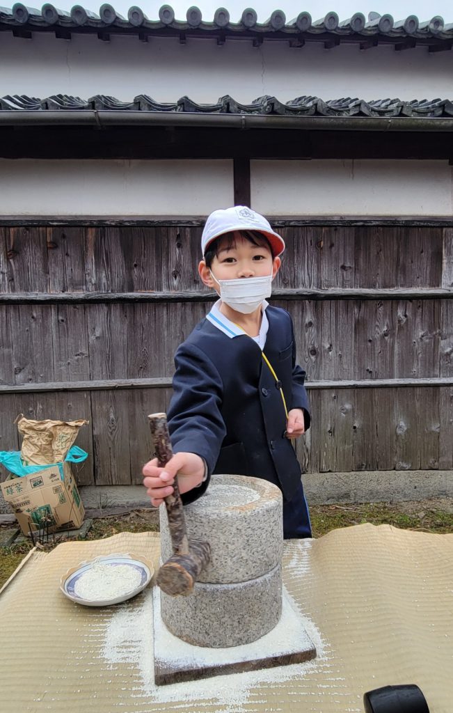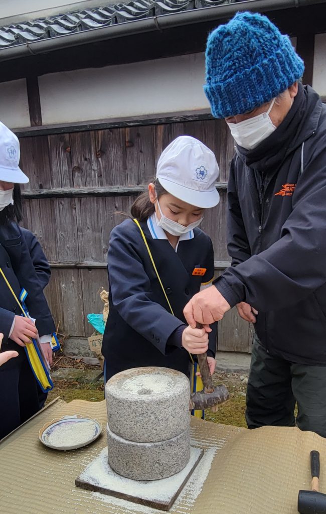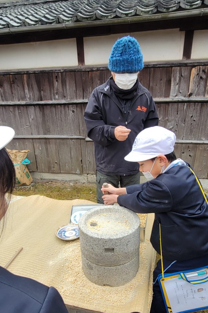 石臼で米や大豆をひいて、米粉やきな粉作りに挑戦しました!