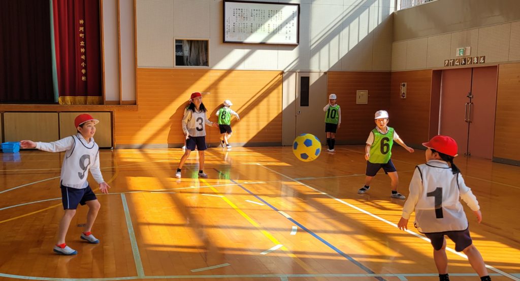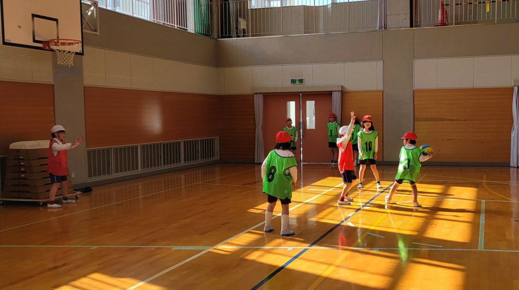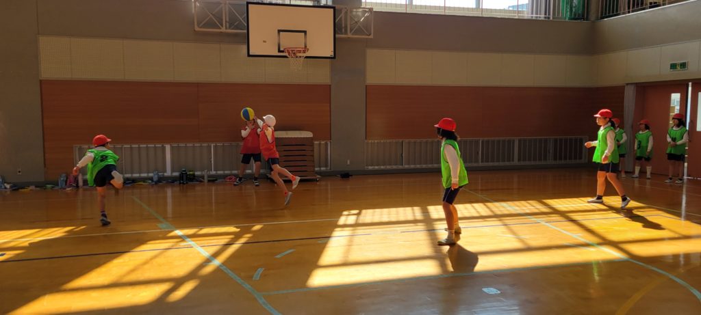 初めてのハンドボールなので、本来のものより簡単なルールで行っています。