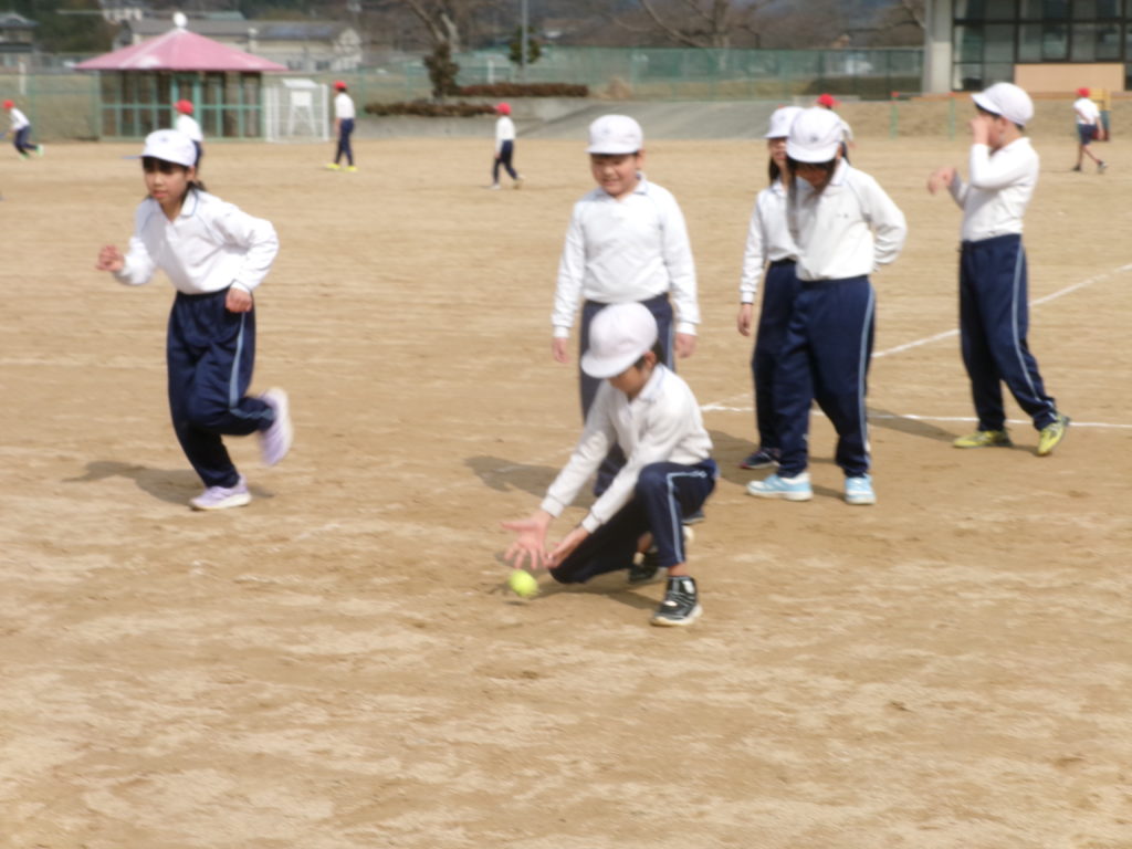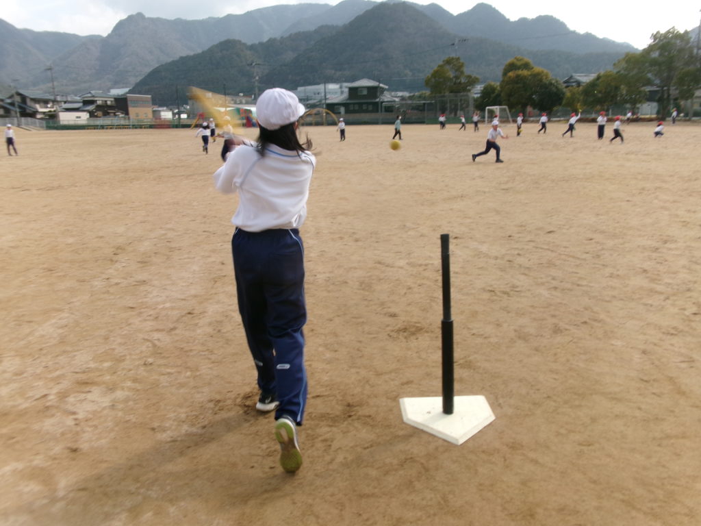 ティーベースに置いたボールを打つのか、投げたボールを打つのかも、それぞれ、自分で選べるようにしました。練習の成果もあり、遠くへボールを飛ばせる児童が増えてきました。