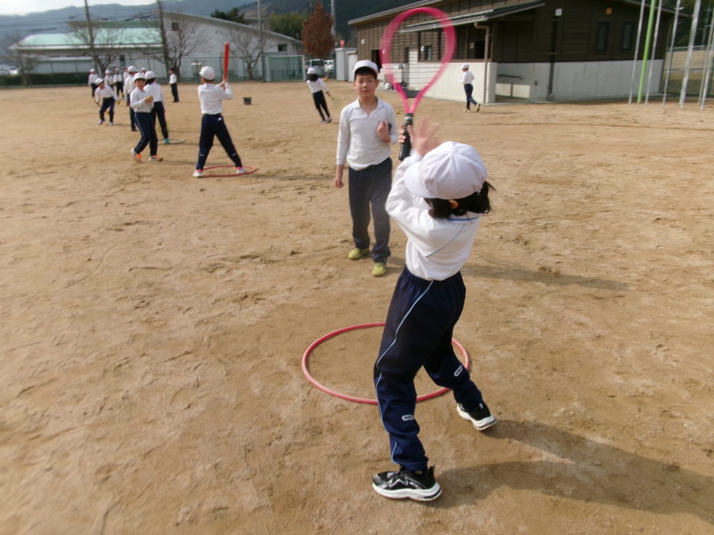 体育でティーボールをしています。野球を簡単なルールにしたものです。ティーベースにのせたボールを、バットやラケットで打ちます。