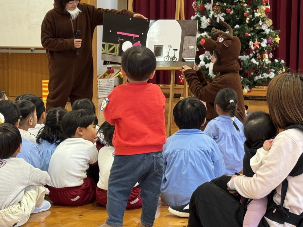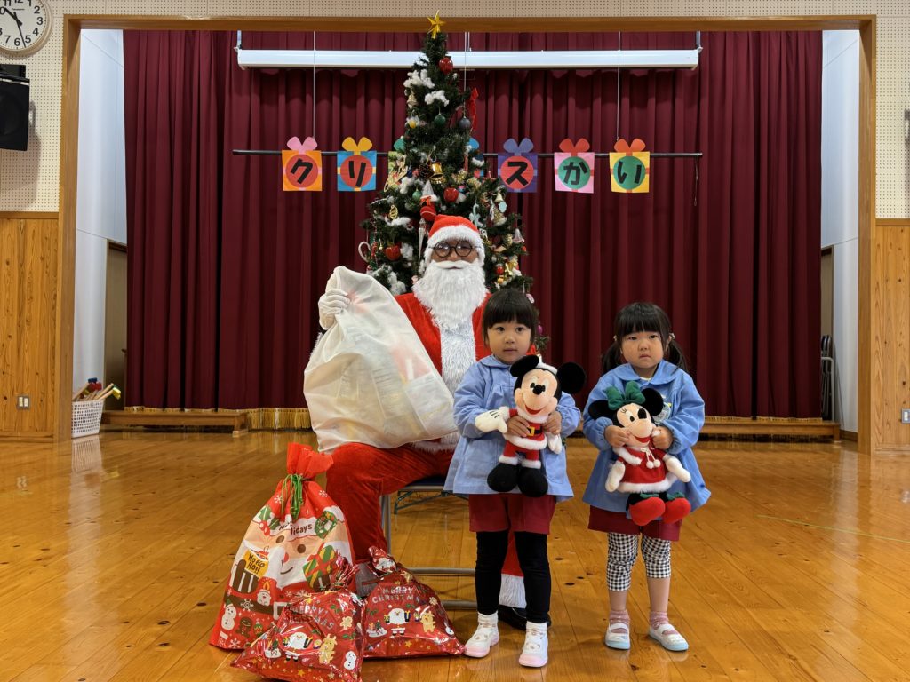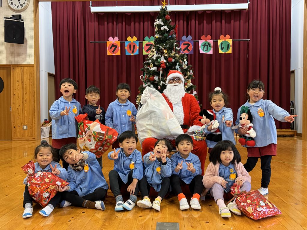 今日はにこにこクラブのみんなとクリスマス会をしていると、♪シャン シャン・・・♪と近づいてくるスズの音に「えっ!?」「サンタさん?」と友達と顔を見合わせる子ども達!そうです!サンタさんがみんなのためにきてくれました。サンタさんに質問したり、歌を聴いてもらったりと盛り上がりました。