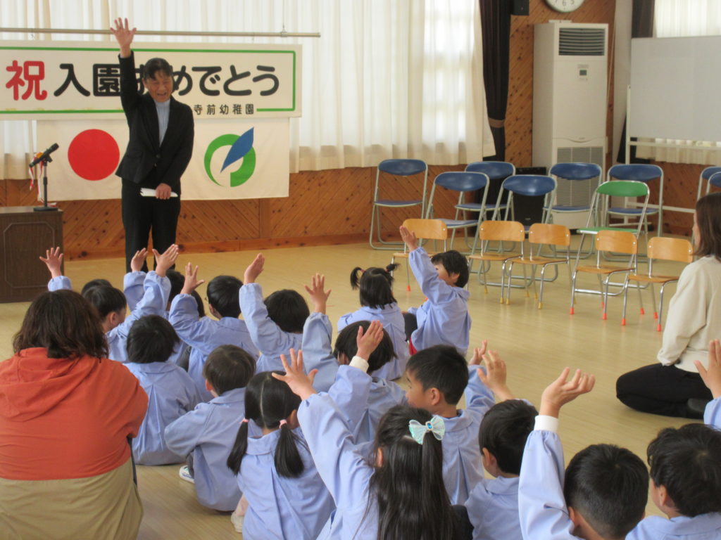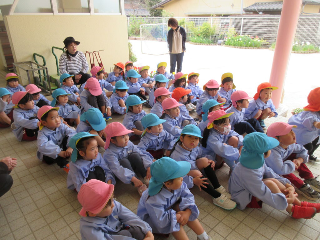 始園式。「今日から、年長さん、年中さんに進級だね。みんなで色んなこと楽しみましょう!」