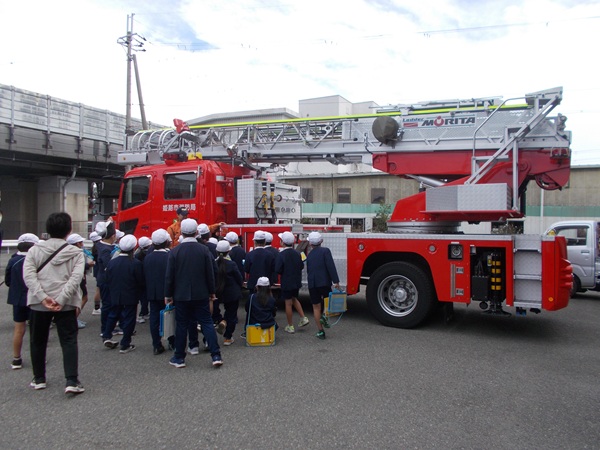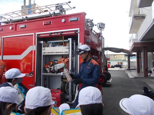 中播消防署へ校外学習に行きました。消防署の方がたくさんの人の命を守るために、様々な工夫や準備をしてくださっていることを知りました。