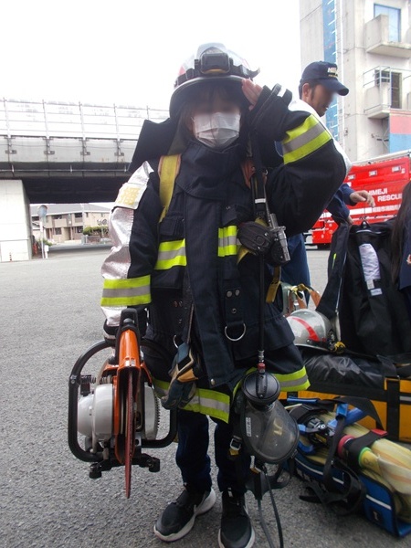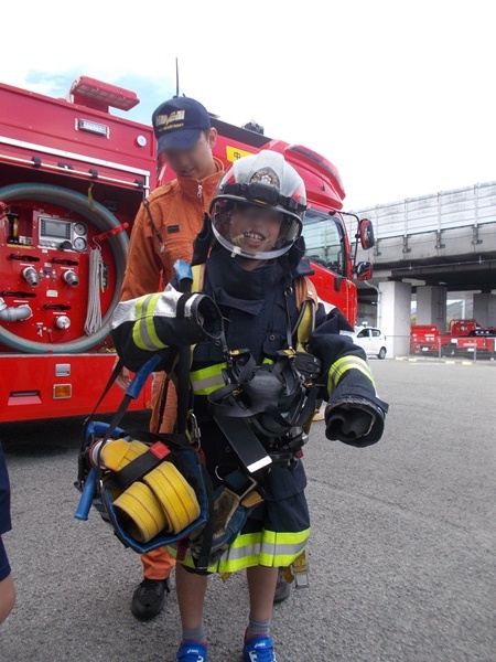 防火服や呼吸器も着せていただきました。未来の消防官を見ているような気持ちになりました。