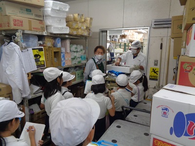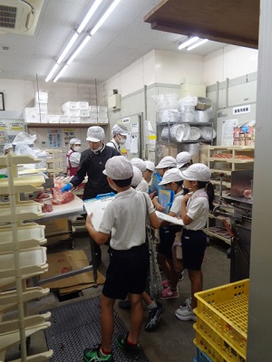3年生は、社会科の学習でスーパーマーケットなどお店の仕事について学習をしています。今回、実際にAコープ粟賀店に見学に行きました。お客さんに商品を買ってもらう工夫などをお店の方に教えていただいたり、普段は入れないバックヤードの様子を見せていただいたりしました。
