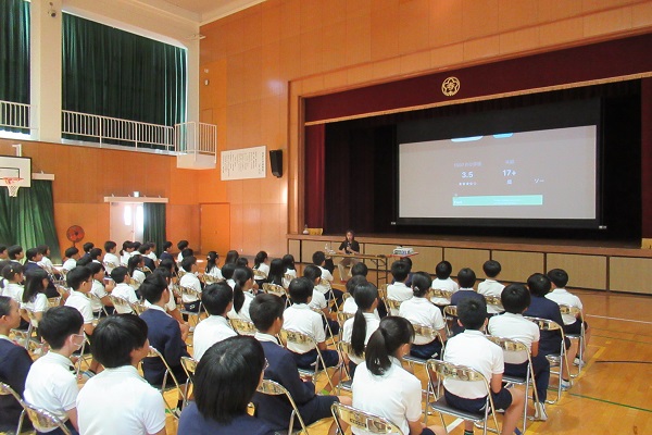 SNSやネット動画の便利さ・楽しさの裏側に隠れる危険についてのお話を聞きました。SNSやネット動画、それに関わる専門用語などが話の中に出てくると、「知っとる。」「やったことがある。」と自慢そうに手をあげる子どもたちでしたが、体や人間関係に及ぼす影響を聞くと、途端に心配そうな表情で真剣に話を聞く様子が見られました。