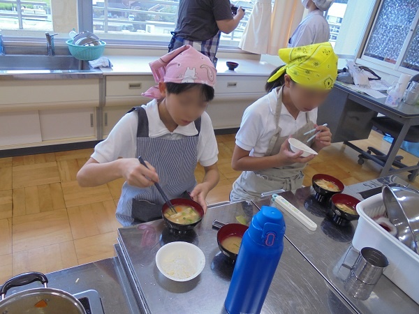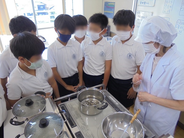 給食センターから栄養士さんに来ていただき、だしの取り方について学びました。だしを取る材料によって、お湯から取るのか水から取るのかが変わることや、たくさんの料理にだしが使われていることを教えていただきました。その後、いりこを使ったみそ汁作りをしました。だしだけではあまりおいしくなくても、みそで味付けすることでだしの風味が引き立ち、いっそうおいしくなることが分かりました。お家でも、みそ汁作りにチャレンジしてほしいです。